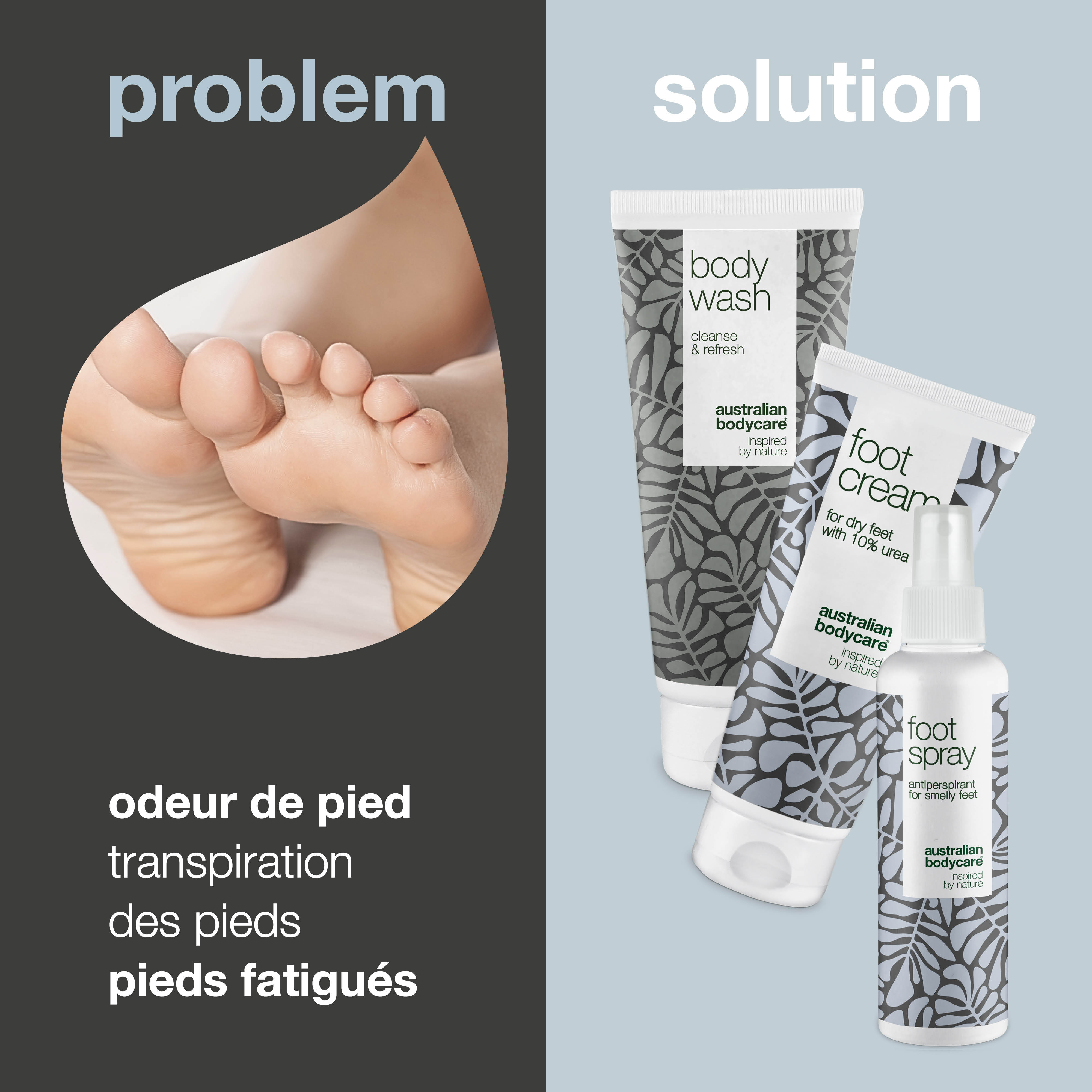Dans la catégorie corps, vous trouverez également des produits pour les orteils douloureux et les pieds malodorants. Le kit de 3 produits pour les pieds lutte efficacement contre les pieds malodorants, afin que vous ne soyez plus gêné par les orteils irrités.